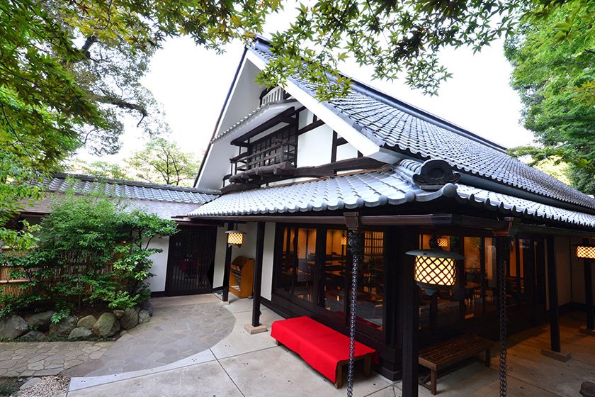 庭園の木立の奥にひっそりと佇む「木春堂」。半世紀以上の時の移ろいを刻んだ、昭和モダンの雰囲気の中、富士山溶岩石の石焼会席をお召し上がりいただけます。