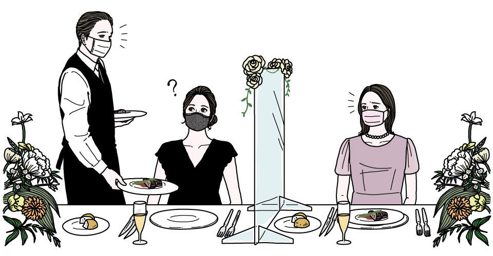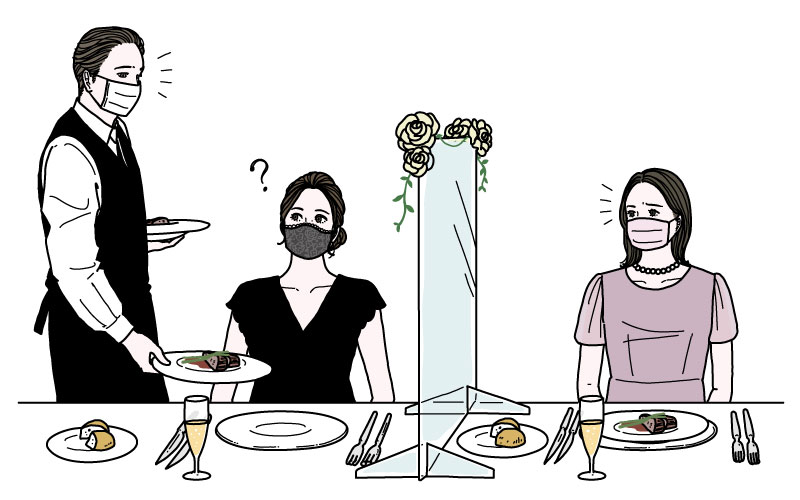 外食のマナー:外したマスクは膝の上に置いて"マスク会食"