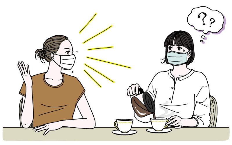 知人友人の家を訪問した時、盛り上がるとつい大きな声が出てしまいますが、コロナ禍において、大声を出すのはNG。お互いの顔が見えないからこそ、言葉選びは丁寧に。声のトーンを高く、口角を上げるように意識すると、マスクをしていても明るくはつらつとした印象を与えます。また、ハンカチ、お手拭き用のタオル、替えのマスク、携帯用のアルコールスプレーなど、最低限の衛生用品は持参しましょう。