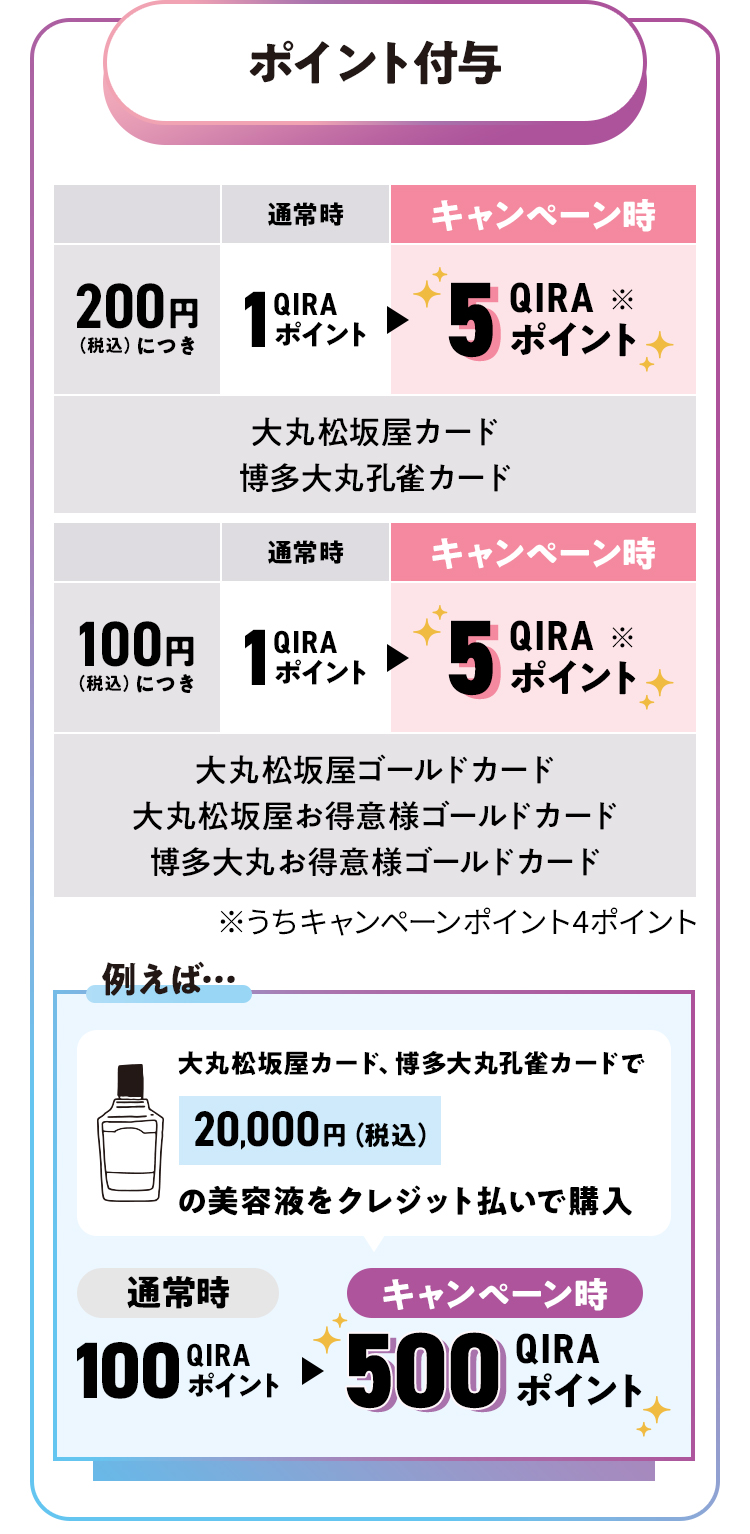 エントリーのうえ、ご利用期間に大丸・松坂屋各店の化粧品売場にて対象カードでのクレジットお支払いでQIRAポイントが通常時の5倍となります。