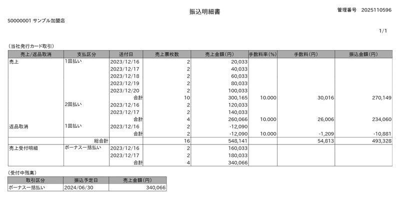 お振込金額については、加盟店売上WEB明細サービスにてご確認いただけます。
