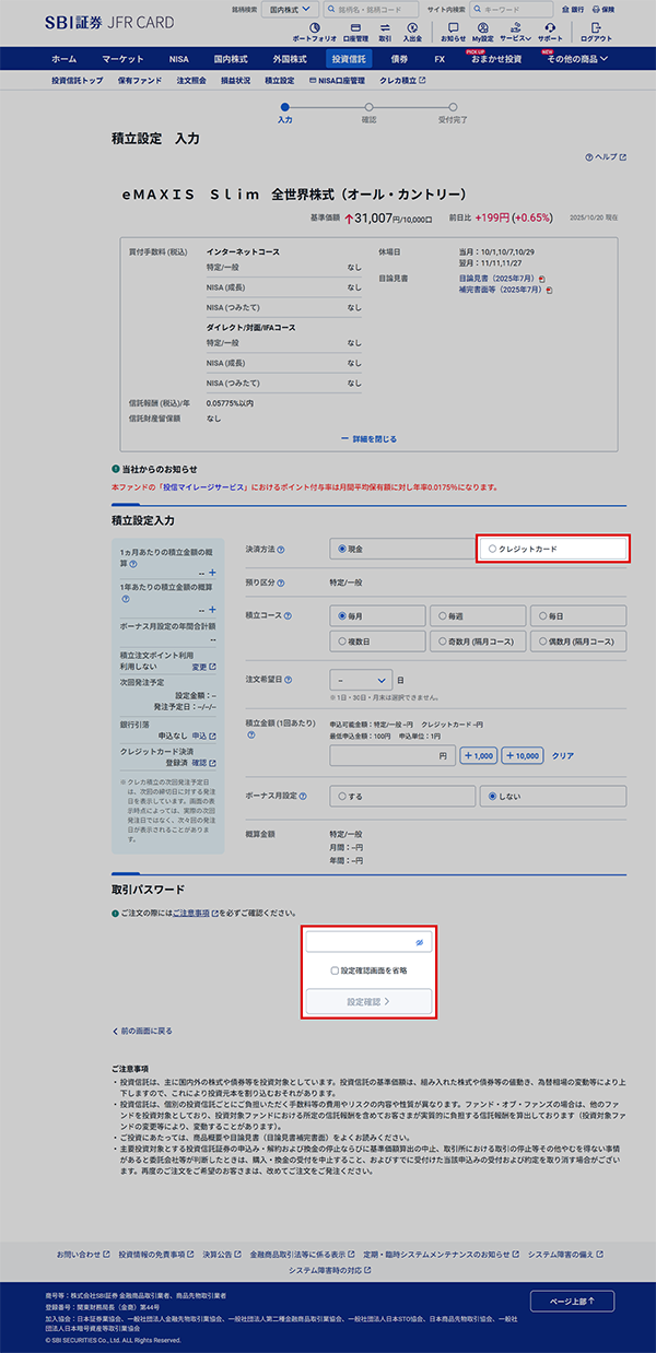③クレジットカードを選択、積立金額を設定し、取引パスワードを入力